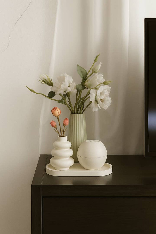 این ست زیبا و جذاب شامل یک عدد گلدان شیاردار با ابعاد 19 در 7 سانتیمتر و به رنگ سبز کله غازی ، یک عدد گلدان آبشاری با ابعاد 12 در 6 سانتیمتر به رنگ سفید صدفی ، یک عدد عود سوز کروی یا ابعاد 10 در 15 سانتیمتر به رنگ سفید صدفی و یک عدد سینی بیضی 22 سانتی به رنگ سفید صدفی میباشد ، مناسب برای روی میز وسط ، روی بوفه یا استند های دیواری ، کنار تلویزیون