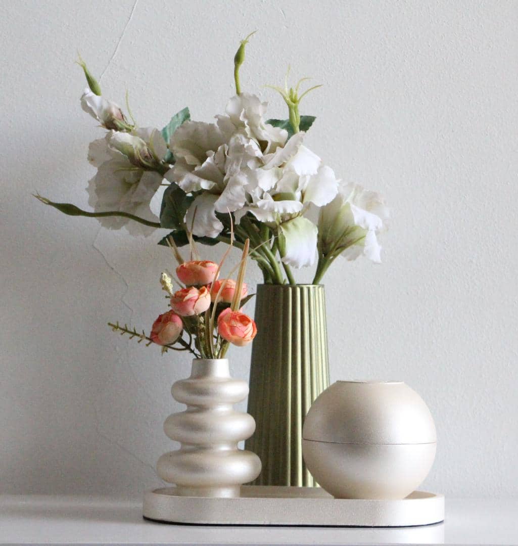 این ست زیبا و جذاب شامل یک عدد گلدان شیاردار با ابعاد 19 در 7 سانتیمتر و به رنگ سبز کله غازی ، یک عدد گلدان آبشاری با ابعاد 12 در 6 سانتیمتر به رنگ سفید صدفی ، یک عدد عود سوز کروی یا ابعاد 10 در 15 سانتیمتر به رنگ سفید صدفی و یک عدد سینی بیضی 22 سانتی به رنگ سفید صدفی میباشد ، مناسب برای روی میز وسط ، روی بوفه یا استند های دیواری ، کنار تلویزیون